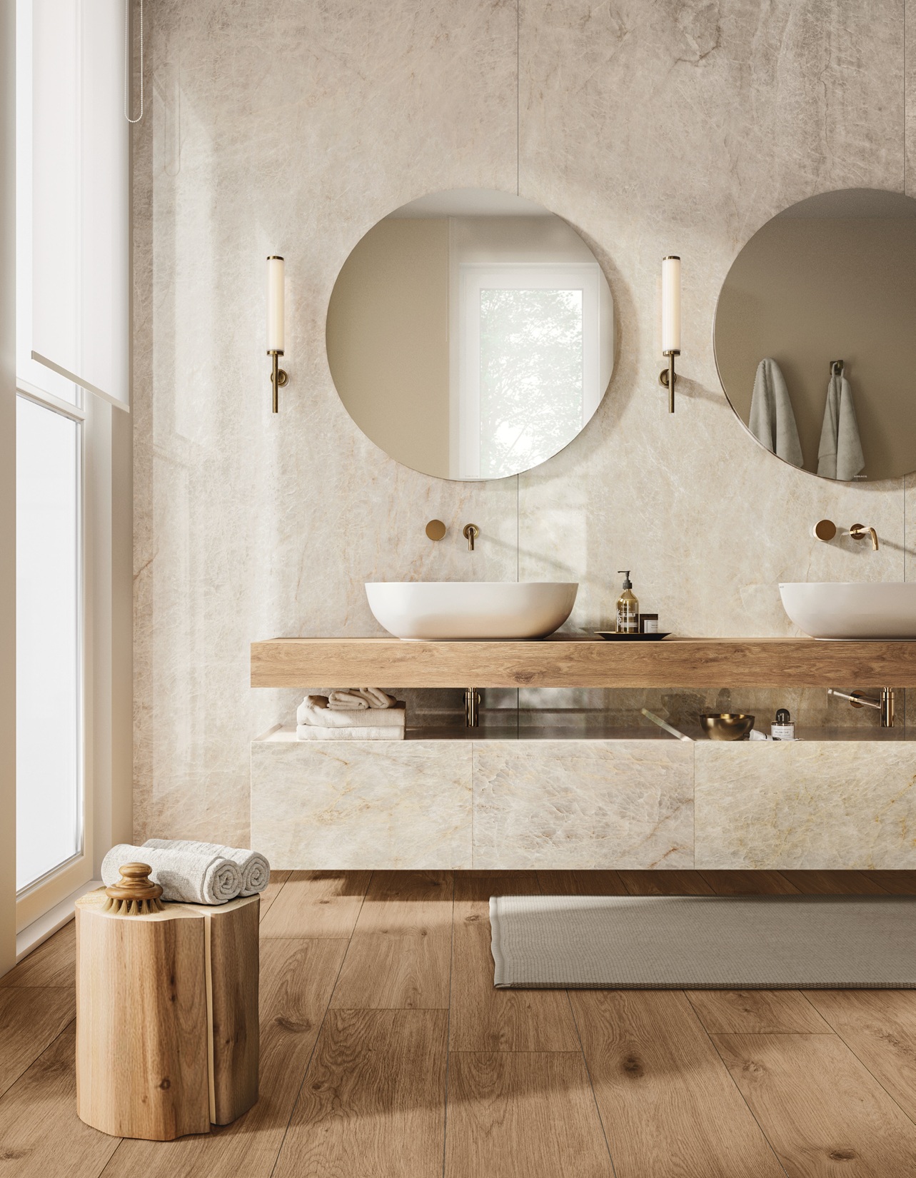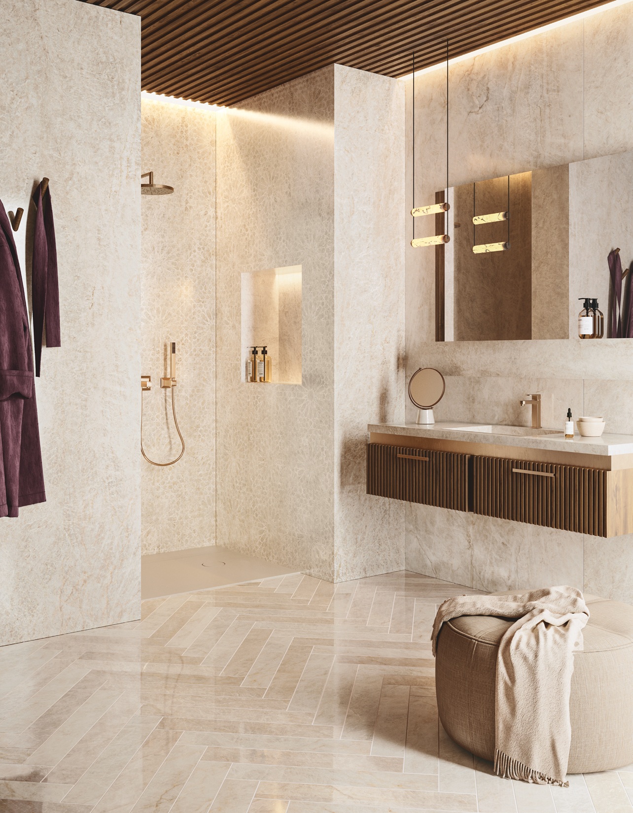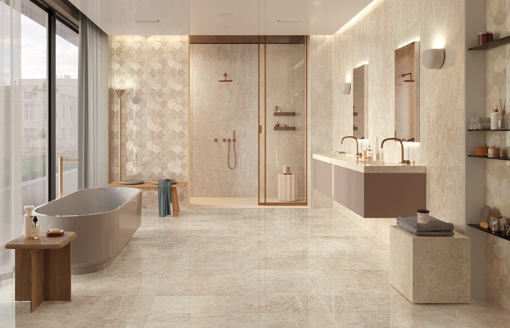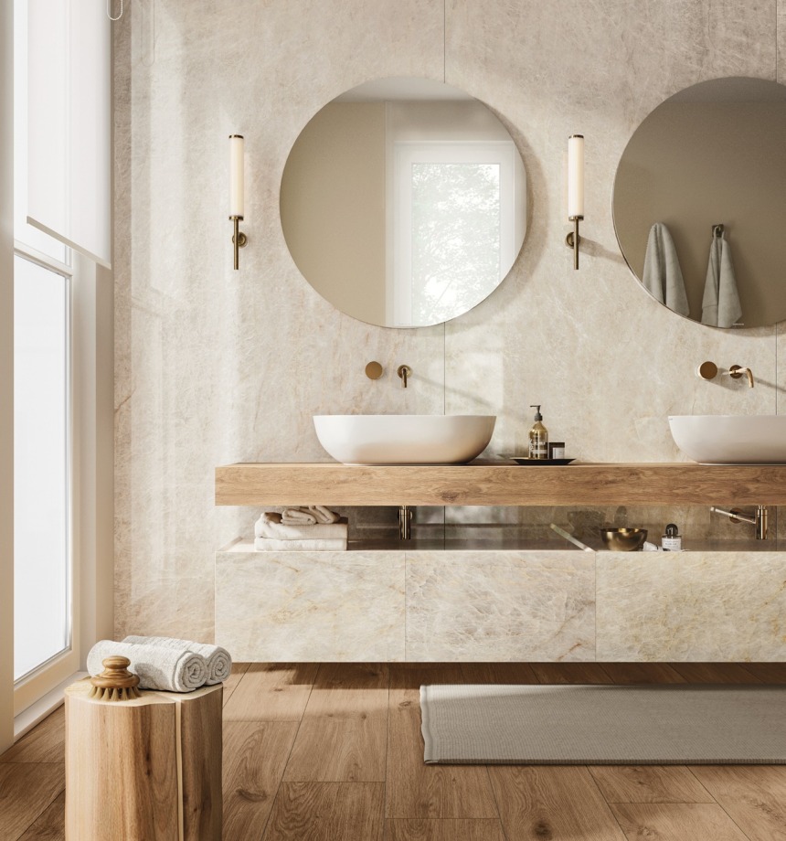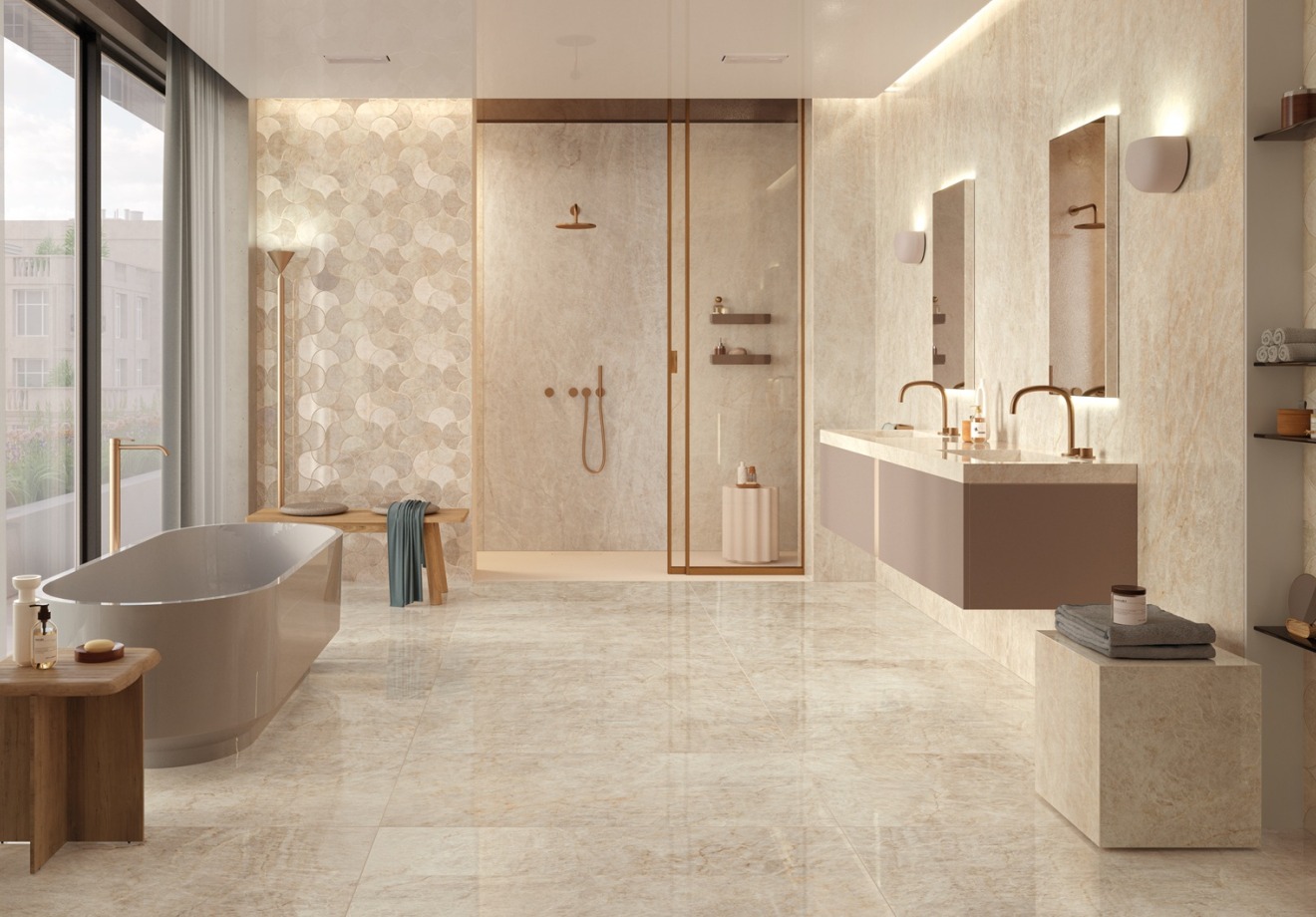 Trys spalvų atspalviai – balta, smėlinė ir šilta šviesiai pilka – bei trys paviršiaus apdailos – LUX su mikroatspindžiais, blizgi poliruota ir natūrali šlifuota – suteikia universalius dizaino sprendimus gyvenamosioms erdvėms, viešosioms patalpoms ir svetingumo projektams, kartu užtikrinant estetinį vientisumą ir taktilinį komfortą.