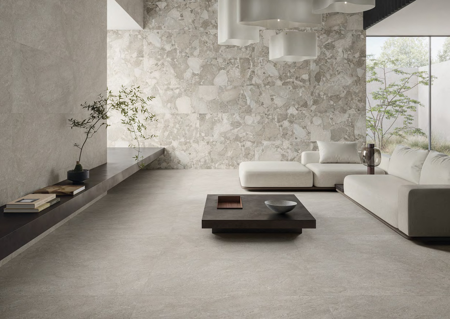 Plytelių Matera Stone tekstūros – Neutra ir Sassi – sukurtos naudoti tiek atskirai, tiek derinant tarpusavyje. Kartu jos tampa stilingo interjero pagrindu, kuriame lytėjimo pojūtį žadinantis akmenukų dinamiškumas keičiasi su santūria neutralios apdailos elegancija.