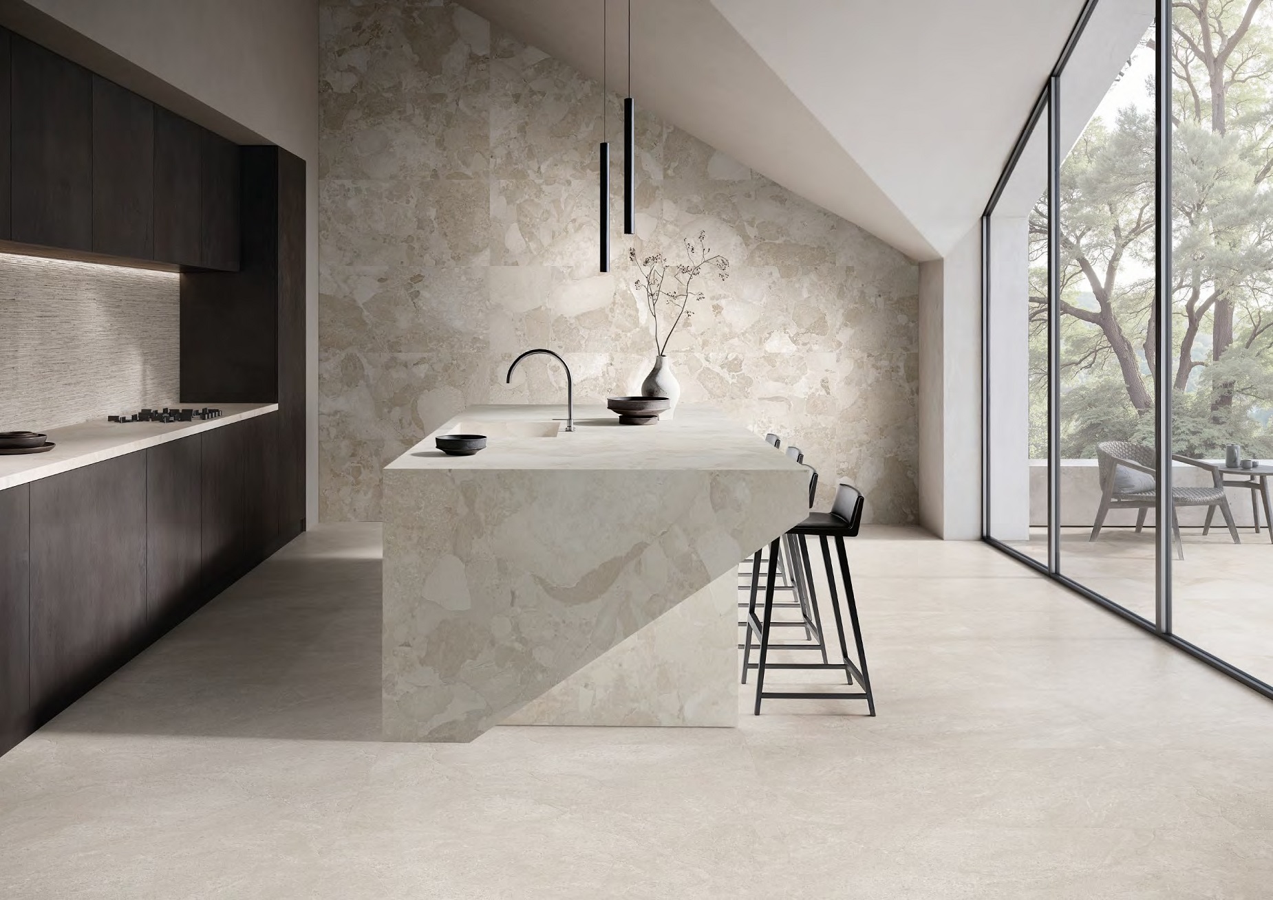 Plytelių Matera Stone tekstūros – Neutra ir Sassi – sukurtos naudoti tiek atskirai, tiek derinant tarpusavyje. Kartu jos tampa stilingo interjero pagrindu, kuriame lytėjimo pojūtį žadinantis akmenukų dinamiškumas keičiasi su santūria neutralios apdailos elegancija.