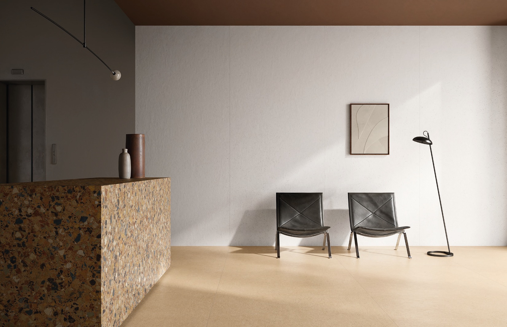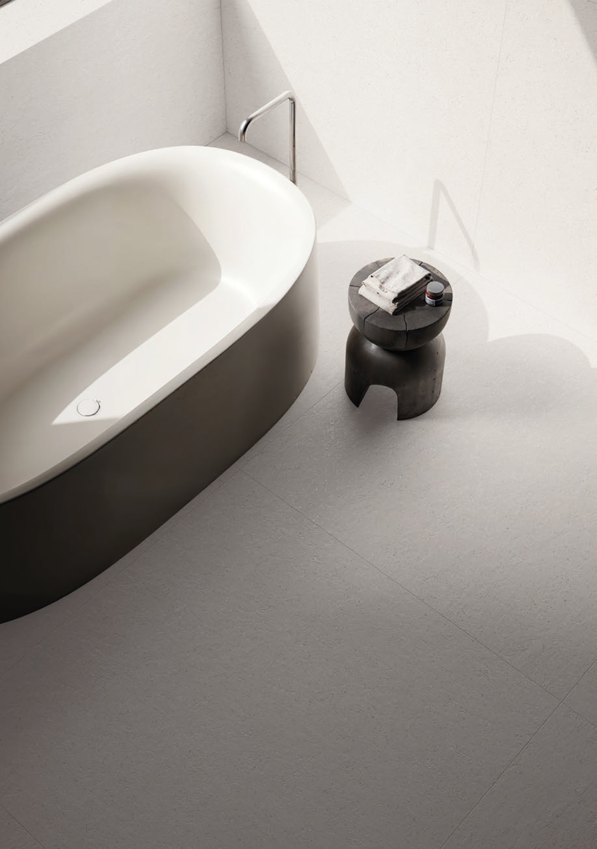 Cohesa Bianco - šviesiausia kolekcijos spalva – švarus, beveik baltas betono tonas. Suteikia erdvei maksimalų lengvumo ir šviesos pojūtį, puikiai tinka mažesnėms ar minimalistinėms erdvėms.