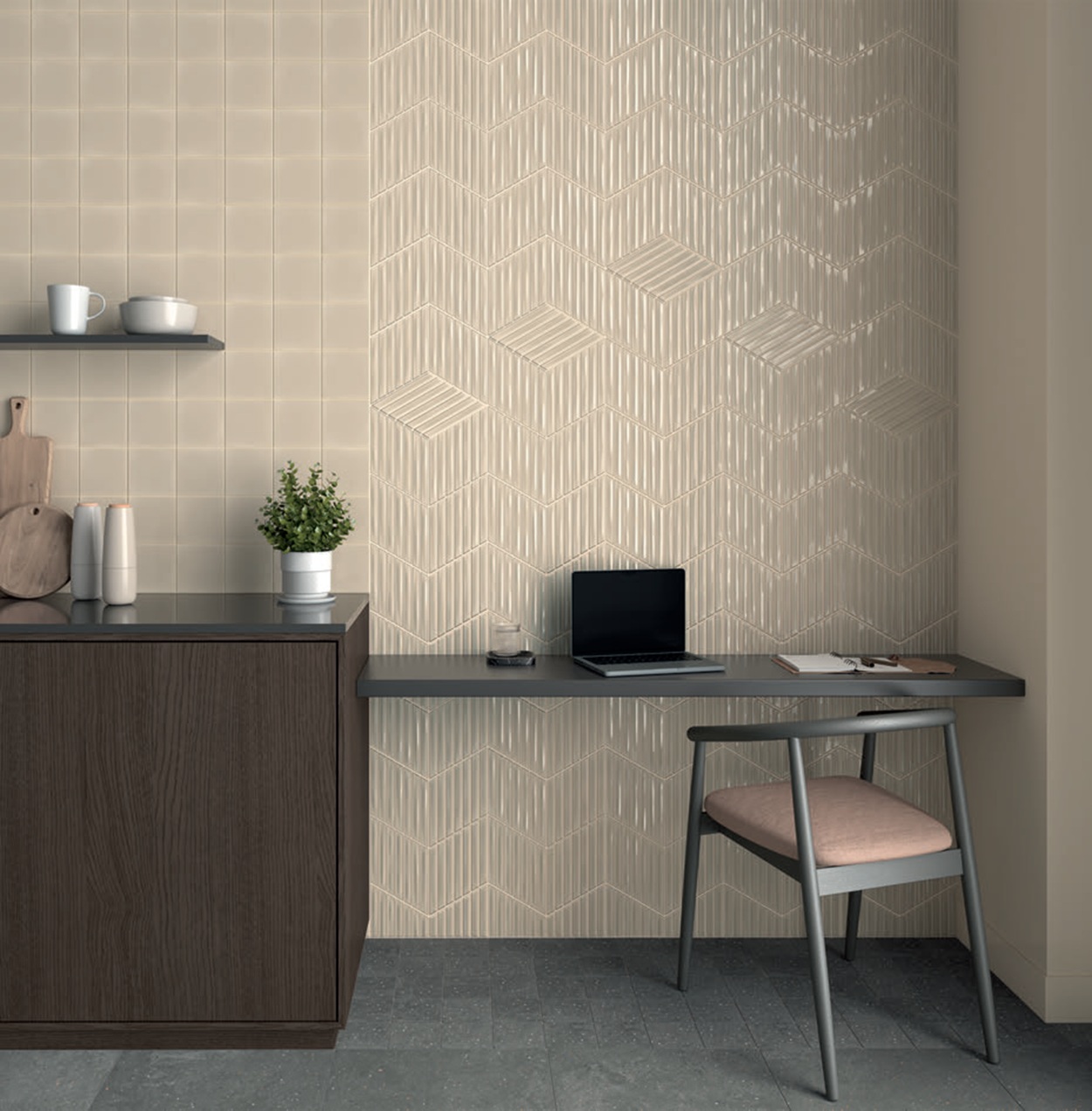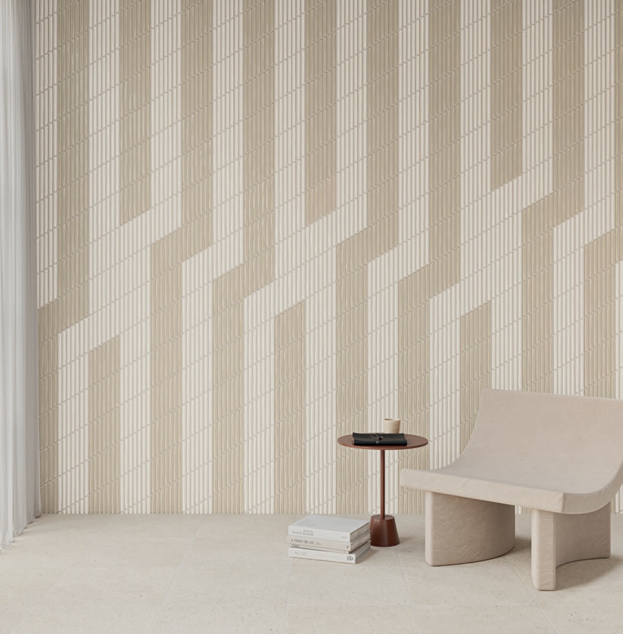 Spike Bars Greige Gloss – išraiškingo reljefo keramikinė sienų plytelė, sukurta sukurti modernų šviesos ir šešėlių efektą. Pailga, smailėjanti forma suteikia sienai gylio ir architektūrinės dinamikos, todėl ši plytelė puikiai tinka akcentinėms vietoms, kur norima išskirtinumo.