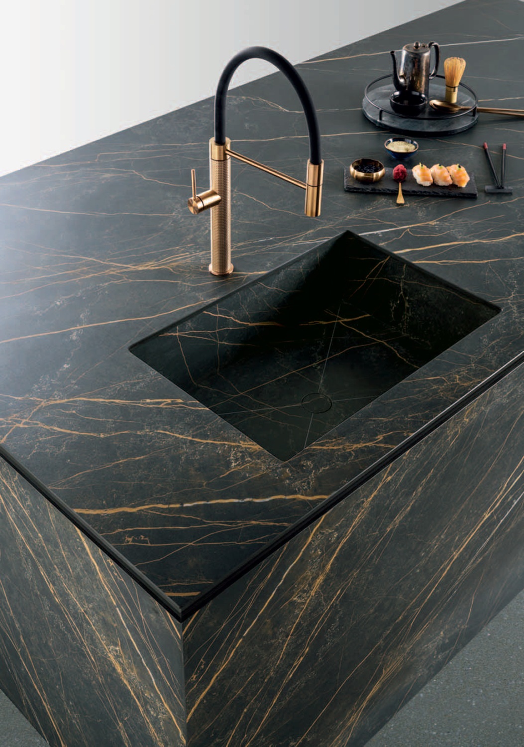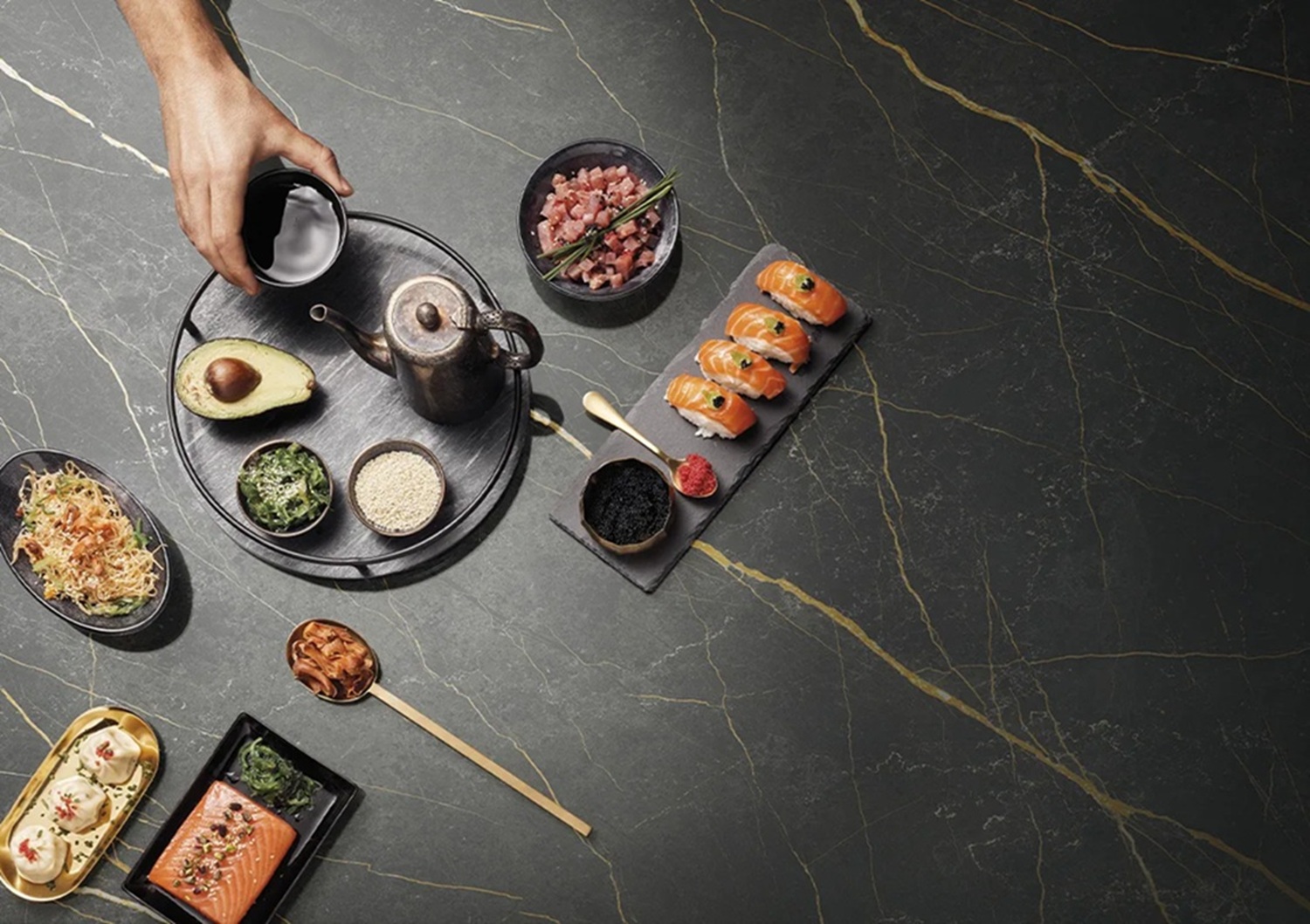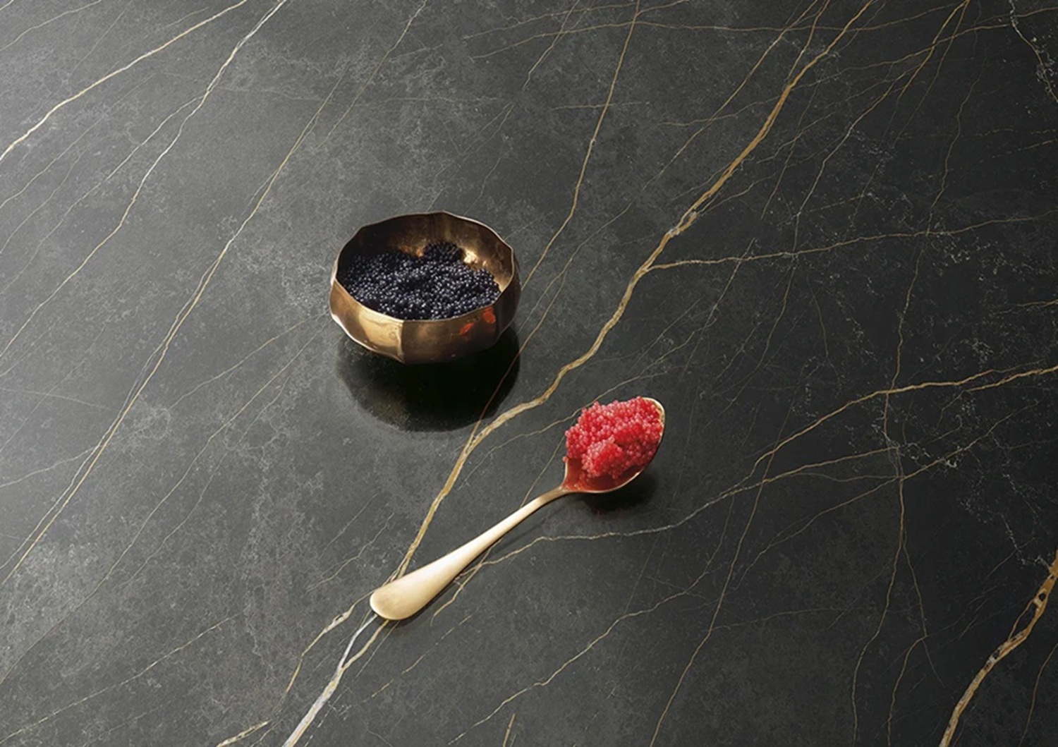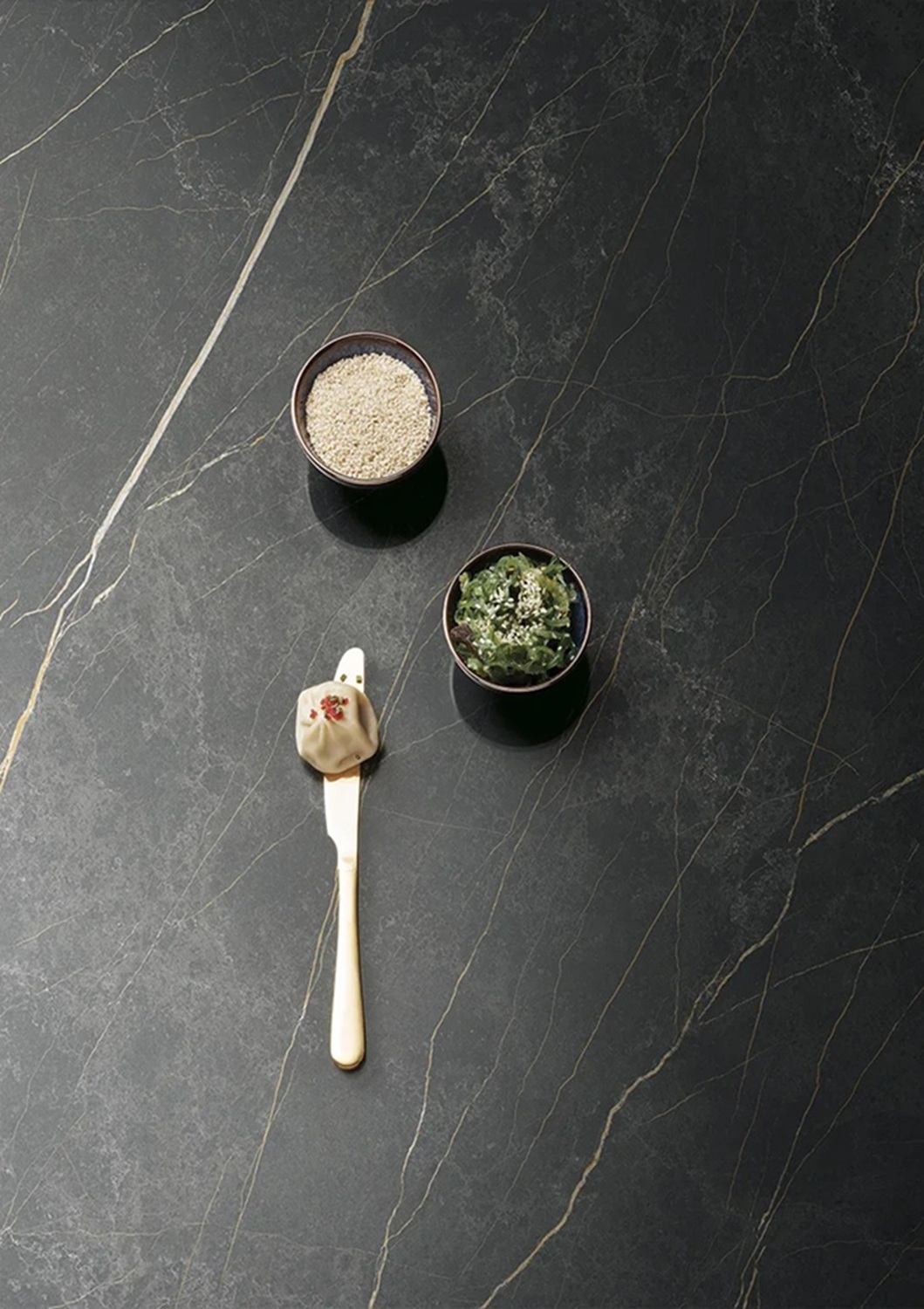 Infinity Royal - juodos spalvos elegancija ir auksinių gyslų prabanga: plokštė, atspindinti natūralaus marmuro turtingumą harmoningame paviršiuje.